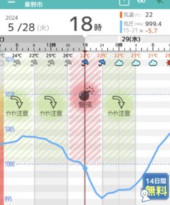 気圧アプリを開いたら…はい、やはりこの通り。ドンピシャで警告タイムでした。
